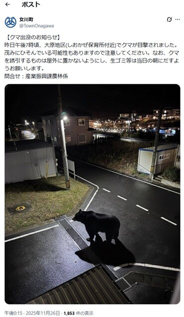 女川町が公式Xに投稿した1枚の画像では、大きなクマが、夜の路上でたたずんでいます。